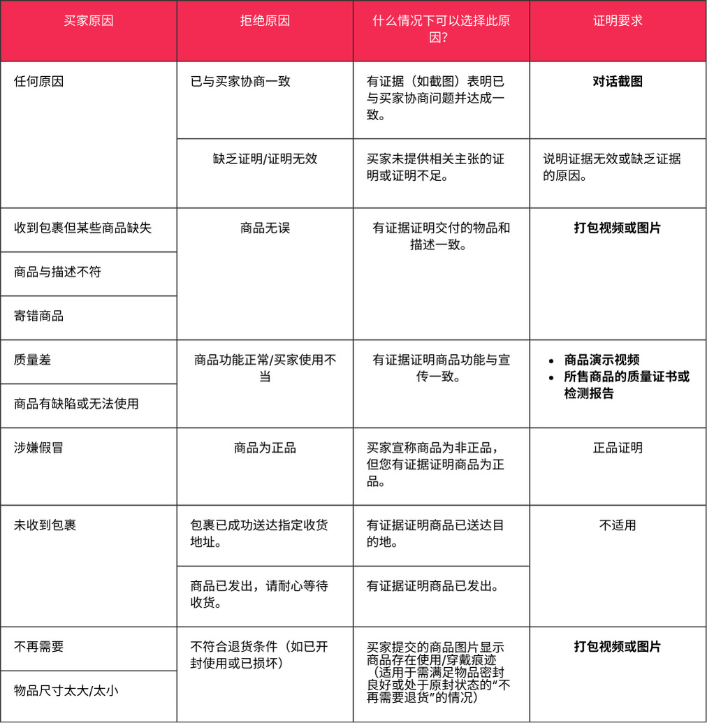 - 如商家对这些原因有异议,可以拒绝买家的申请或提交申诉,但需提供有效的充分证据。