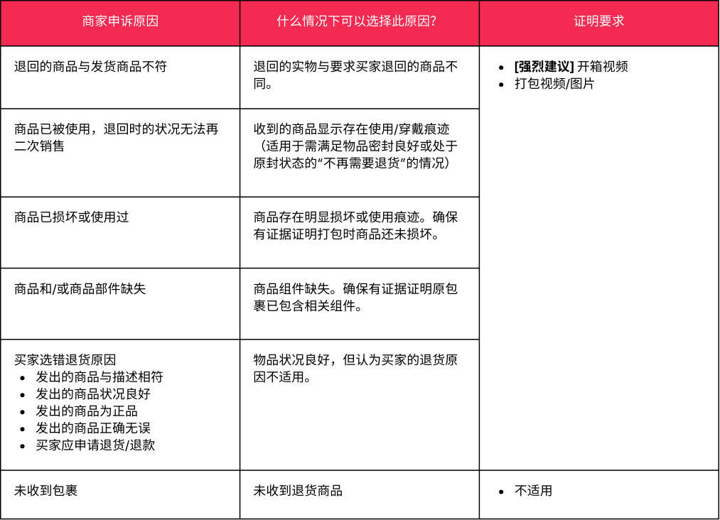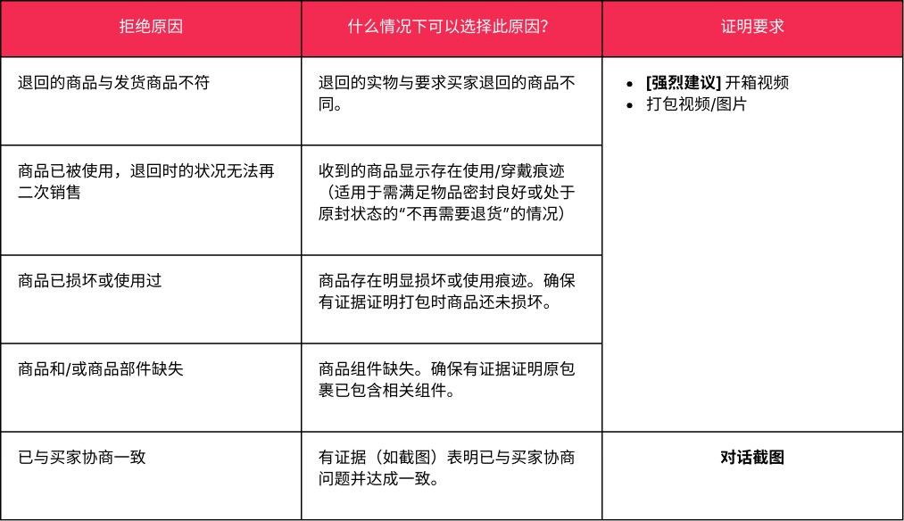 - 对于不影响商责退货/退款率(SFRR)的原因,仅当买家退回的商品状况不符合退货商品的状况要求时(如商品封条已破损或商品无法再次销售等),商家才能拒绝申请或提交申诉。