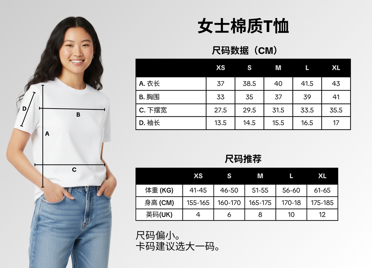 - 添加合身说明。例如:“模特身高170厘米,体重52公斤,穿S码。标准尺码版型。”