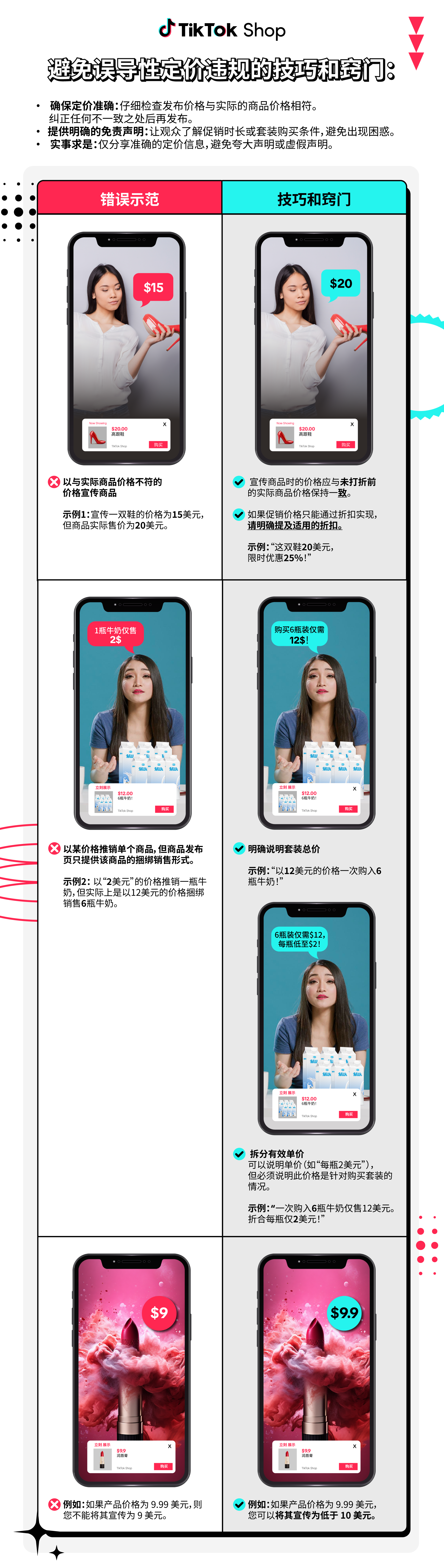 这是指直播或视频中宣传的价格与实际商品价格不一致。示例:某商品价格为$9.99,可以宣传称不到$10,但不能宣传称为$9。