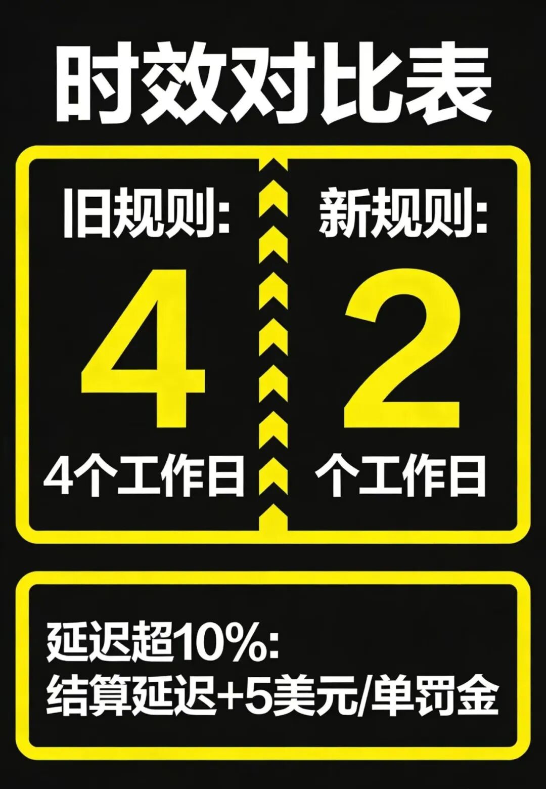 订单需2个工作日内更新“运输中”状态(此前为4个工作日),延迟超10%将触发结算延迟+5美元/单罚金!