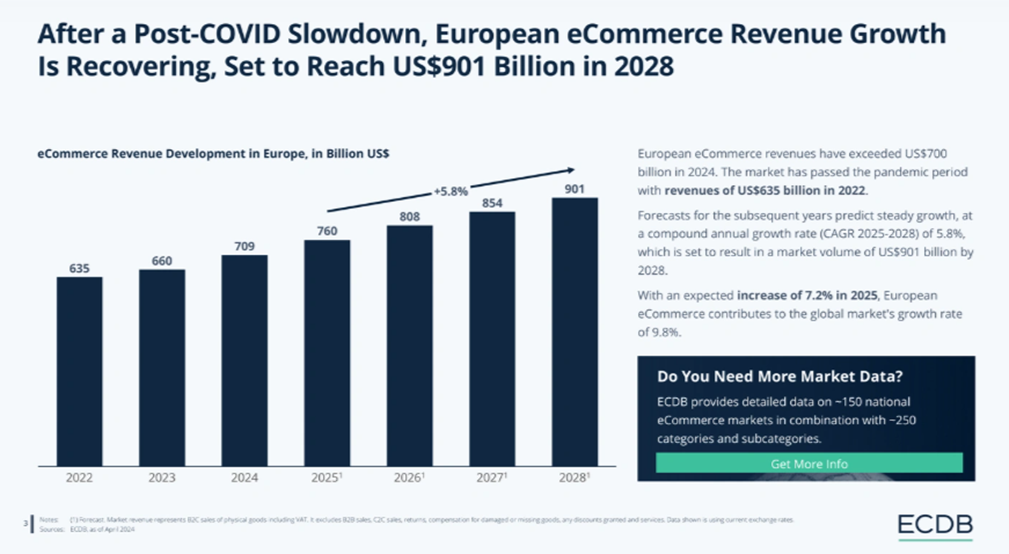 欧洲电商市场将稳步增长 图源:ECDB